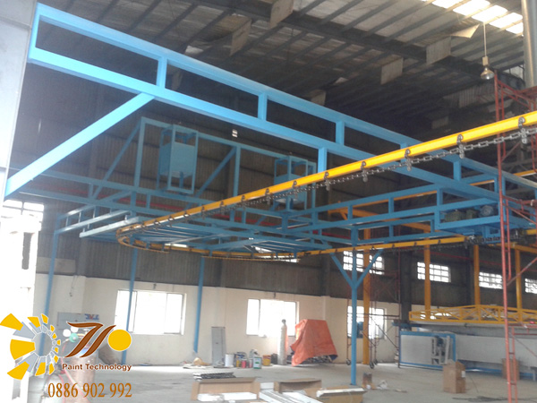 Sản phẩm cần sơn sẽ được treo lên băng chuyền đi vào bể chứa để làm sạch và đi vào lò sấy để sấy khô trước khi bước vào giai đoạn sơn. Khi băng chuyền đưa sản phẩm vào buồng phun sơn thì thợ sơn có nhiệm vụ sơn phủ bề mặt sản phẩm nhờ sự hỗ trợ của súng phun sơn. Sau đó sản phẩm sẽ được đưa qua lò sấy để sấy định hình làm tăng độ chắc và độ bám dính của bề mặt sơn. Quy trình này sẽ liên tục được thực hiện, các công nhân sẽ phải treo sản phẩm vào và lấy thành phẩm ra trong thời gian quy định.